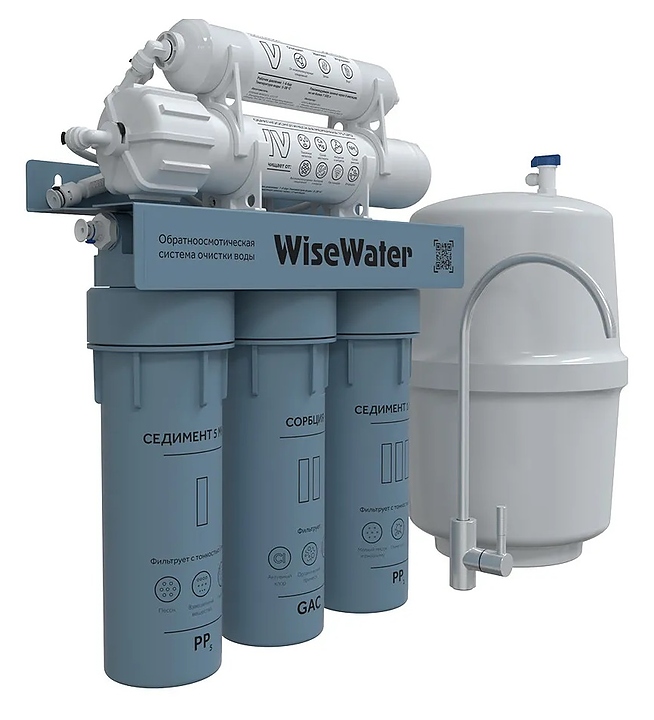 Обратноосмотическая система WiseWater Osmos Mineral с отдельным двухрожковым краном и накопительным баком предназначена для очистки водопроводной воды от жёсткости, железа, запаха сероводорода, марганца, аммония, взвешенных веществ и бактерий. Включает в себя 6 ступеней очистки воды с минерализацией.